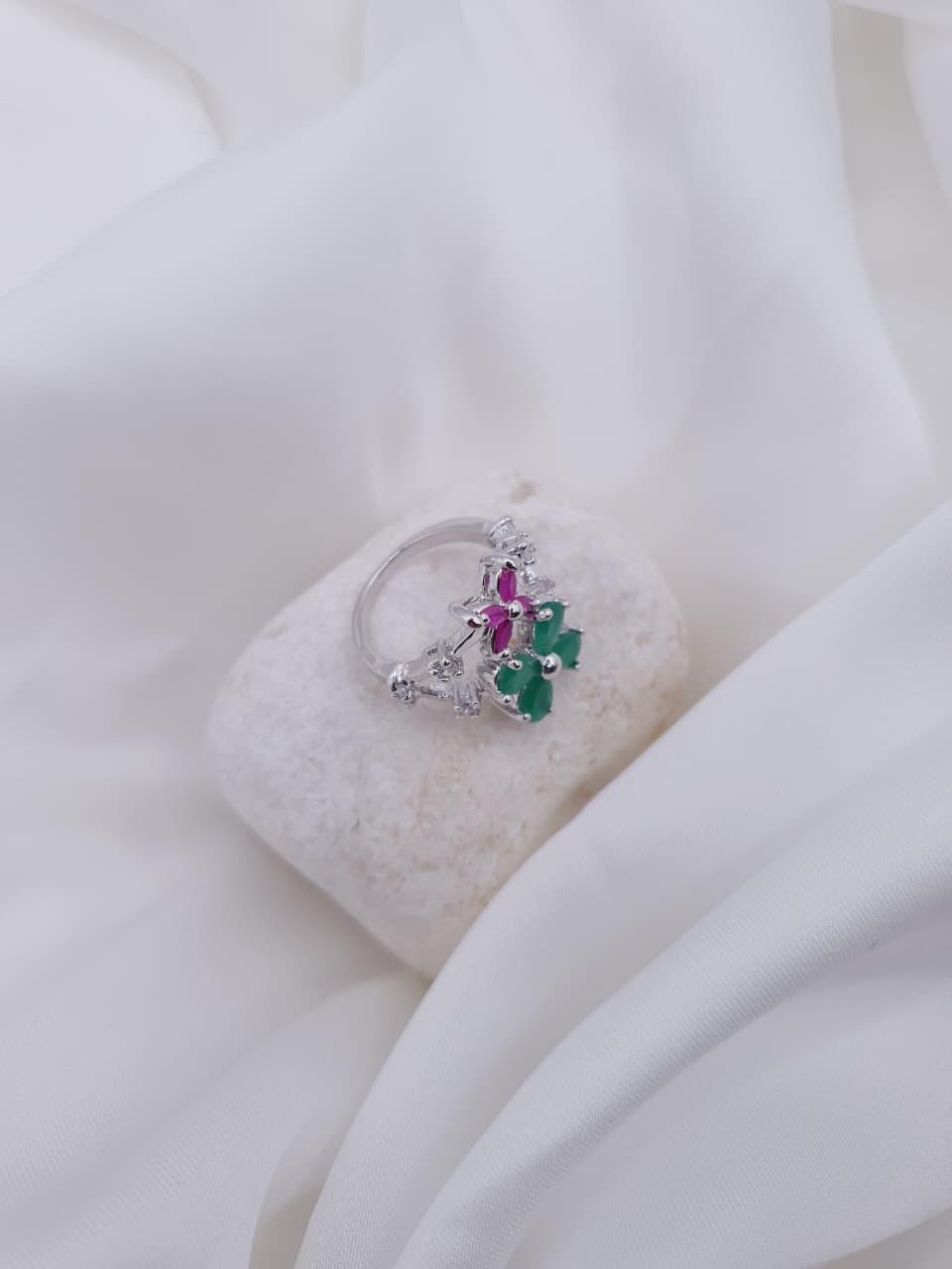 Add a touch of floral elegance to your look with this beautifully crafted statement ring featuring emerald green and ruby pink petal stones arranged in a delicate bloom design. Accented with sparkling zircon details on a sleek silver-plated band, this ring brings together color, shine, and sophistication in one graceful piece.